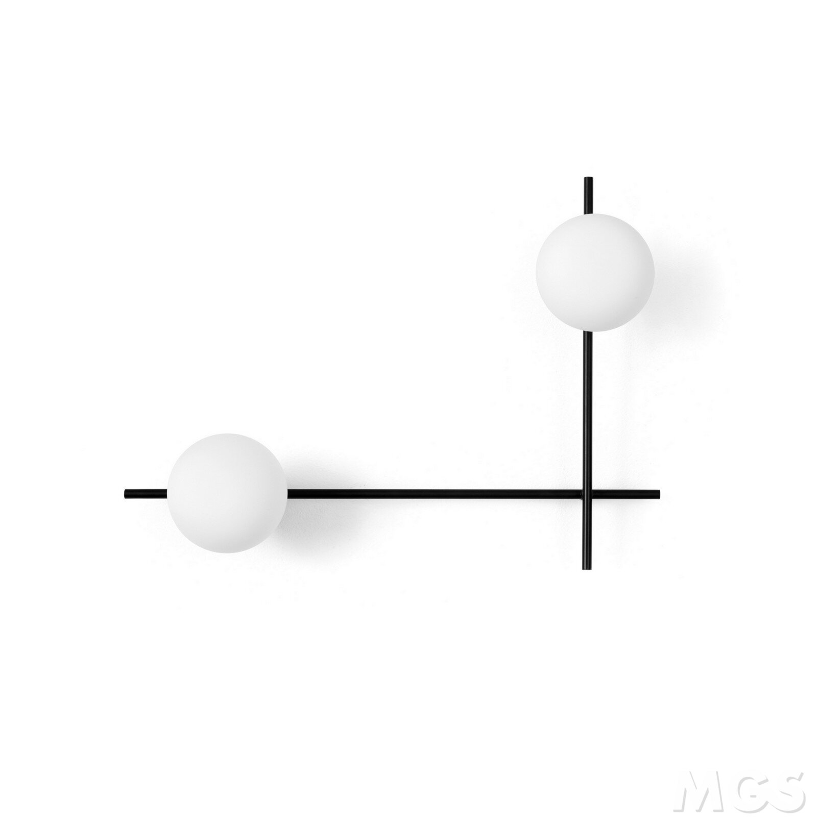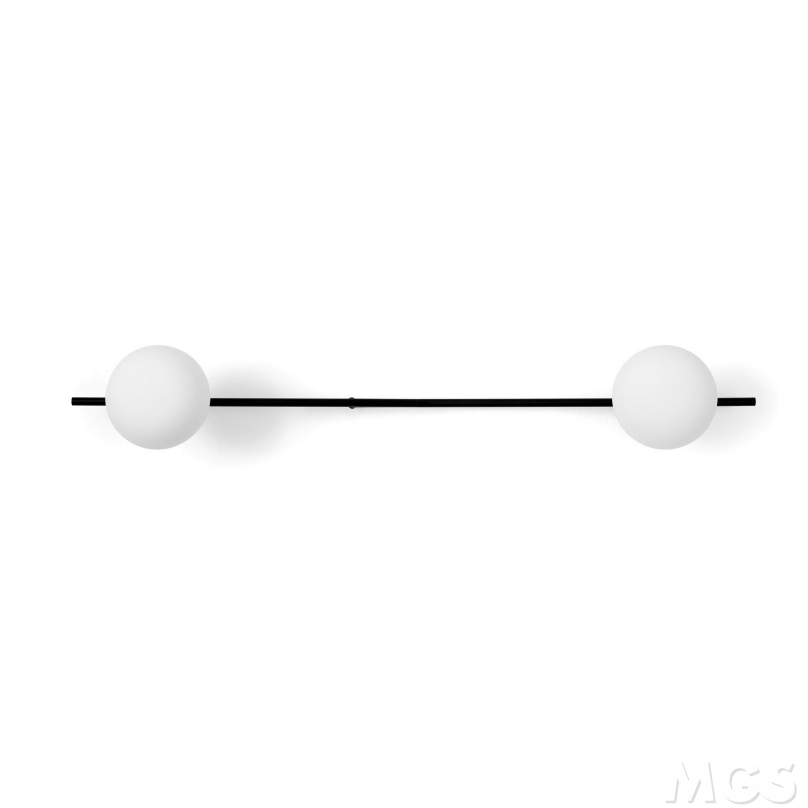 2 luces Lámpara de pared o de techo con estructura de metal pintado en polvo soft touch negro. Difusor de vidrio soplado blanco lechoso, diámetro 14 cm. La rotación del brazo secundario permite elegir la posición preferida.GANADOR BUEN DISEÑO